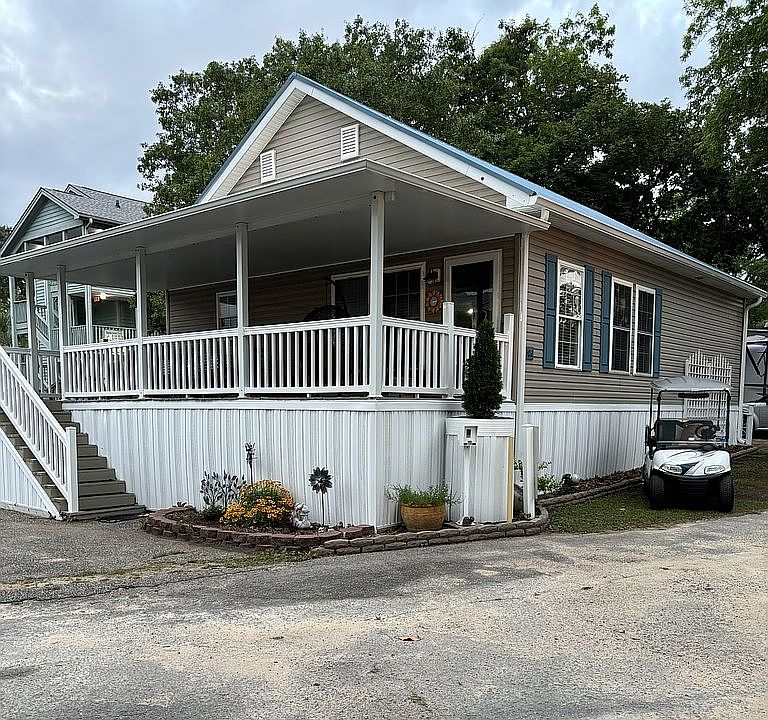 Perfectly Charming on Lake Perry! This is a unique opportunity! Originally, Lakewood Campground erected this house on lot #3002 for use as their property office. This 23-year-old manufactured wood house is classified as a mobile home because the concrete blocks as well as a foundation trailer. The annual lease allows permanent residents full access to all campground amenities. The ocean shoreline is only 1/2 mile away. There is 980 Sq Ft. of indoor space with an additional 270 Sq. Ft. covered porch. Sitting directly across from Lake Perry, it sits on a shaded lot in the best campground spot. The back porch is equipped with a handicap ramp. It has vinyl siding, metal roof, gutters, and downspouts (brand new), efficient central heat & air, new vinyl plank flooring. Inside: 3bd/2 full bath (one is an ensuite, the other is Jack & Jill) Furnished (or not: negotiable) Sculpted mid-heaight baseboards (5 1/2?), vaulted ceilings and wide crown moulding throughout, shiplap, vinyl blinds, ceiling fans in 2 bedrooms and the living room. Central Heat & Air (Honeywell HVAC is 5 yrs. old) 80 Gallon Water Heater LG Thin Q Washer/Dryer (2 Years Old) Lots of Cabinets in the Kitchen Refrigerator Dishwasher Microwave Stove- Electric Stainless Steel Grill Television Lots of Closet Space Lots of Secure Storage 3 Parking Spots Golf Cart
