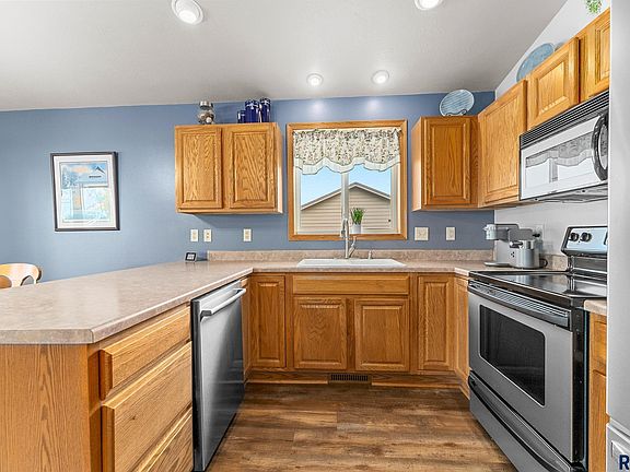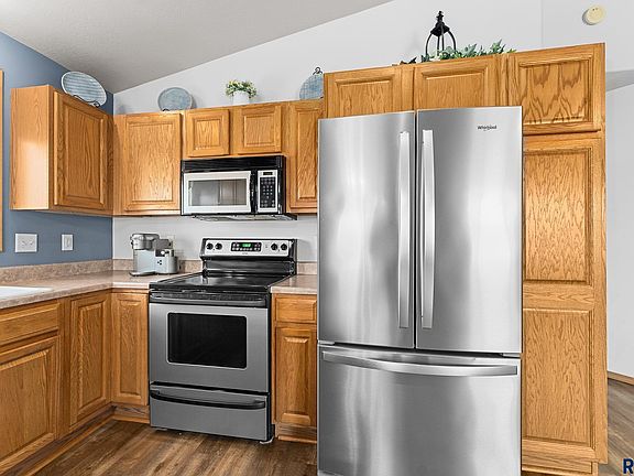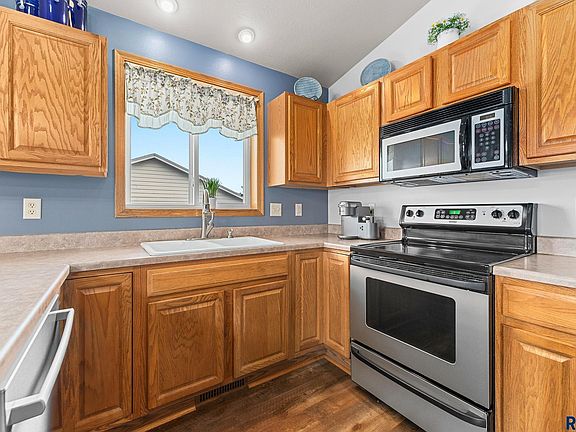 This meticulously maintained 4 bed, 2 bath split foyer home is located in sought-after southwest Sioux Falls. From the moment you drive up to this home you will notice pride in ownership. The spacious entry with a coat closet leads you to the main level with an open floor plan, vaulted ceilings and lots of natural light. The kitchen has SS appliances, abundant cabinets, dining area, and sliders that take you to the oversized deck with pergola. The main level is completed with 2 bedrooms and a full bath. Moving to the lower level, the large L-shaped family room is perfect for entertaining or just relaxing by the gas fireplace, and features 2 additional bedrooms, a full bath, and a laundry room with storage. Updates include water heater in 2024, shingles in 2021, exterior & interior paint, luxury vinyl flooring on main, dishwasher & fridge in 2020 and furnace in 2018. The beautiful backyard includes a cedar fence, trees, & sprinkler system. This is a must see!