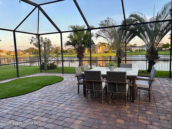 Amazing water views in highly desirable Viera! This 4BR/3BA, 3-car garage home sits on an oversized lot designed for comfort and entertaining. The central kitchen features updated quartz countertops, updated tile backsplash, refreshed cabinetry, a large island, eat-in nook, and abundant storage. An open-concept layout flows into the living and dining areas, enhanced by wood-look laminate flooring and triple sliding doors that fill the home with natural light. Step outside to your backyard retreat with screened, covered paver patio, stacked-stone with granite & free standing cozy fire pit—all overlooking tranquil water views. The great room showcases a modern electric fireplace, while the primary suite offers a spa-like bath with dual vanities and a custom-organized walk-in closet. Additional updates include plantation shutters throughout, newer roof (2021), newer A/C (2020), and new carpet in two bedrooms.