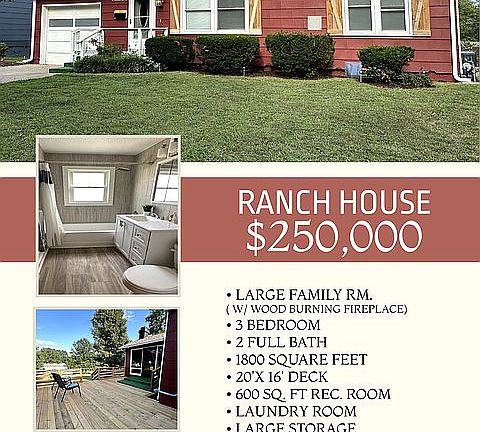 Remodeled Ranch in the City of Gladstone. 3 br, 2 bath, Family room with woodburning firplace, Butcher block countertops in the Kitchen with a new dishwasher. Custom wood features thruout the house 16x20 ft deck 1 car garage w/4 car driveway All new flooring. Bedrooms have new carpet. Fully remodeled Bathroom up and down Fenced in Yard Furnace. hot water heater and roof are 5 years old. A/C is brand new. The finished basement can be used as a rec room or a bedroom. Maybe even a rental. The basement also has a large storage room or shop room. There are laundry hookups in the basement and in the garage.