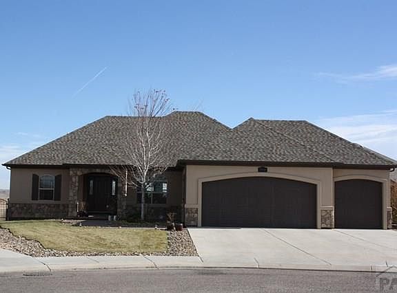 Awe inspiring would be an understatement for this well-appointed custom ranch style home that boasts a total of 3754 square feet -- 1877 finished on the main level, with the remaining 1877 in the basement ready for the new owner(s) to finish and customize. Upon driving up to this beautiful home, situated on 1/4 acre of profession landscaping, you will be greeted by the appealing architectural roof lines, the massive stone entryway and the three car expansive garage. The interior of the home will entice even the most discriminating buyers who will love the hardwood and tiled flooring and decorative architectural enhancements throughout. The kitchen is a chef's paradise and includes all upgraded appliances. Highlighting the spacious living room is a gas log fireplace, which will provide warmth and a comfortable ambience to be enjoyed throughout the winter months. High on many buyer's lists of "must haves" is a luxurious masters suite and this one doesn't disappoint with french doors to an exterior patio and a large 5 piece master bath, complete with a jetted tub. With Pueblo's moderate year-round weather, the covered and open rear decks assure many hours of relaxation and entertaining.
