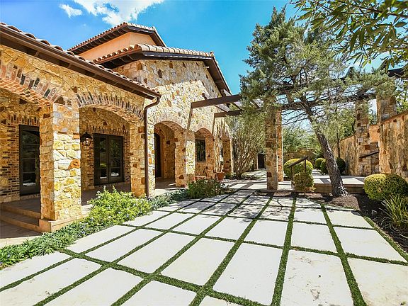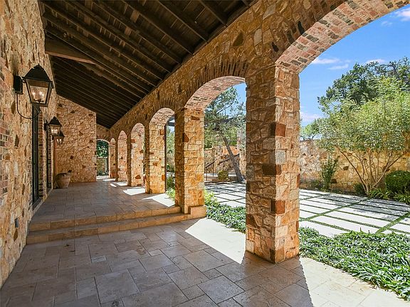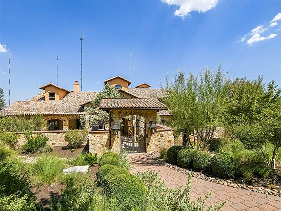 This exquisite estate situated high on a private hilltop in Davenport Ranch boasts exceptional architecture, sprawling lush landscapes, and captivating city views. Nestled on a private 2.8-acre lot, the residence features a helicopter pad, 4-car garage, 3 fireplaces, sprawling covered terrace and numerous outdoor retreats. Enter the private front courtyard into the single-story abode with a dramatic Foyer, spacious formal living and formal dining adorned with a decorative gas fireplace and abundant windows that infuse the space with natural light. The Study, embellished with custom built-ins, wet bar, and beverage fridge, provides an elegant segue to the Primary Suite with private access to the serene backyard oasis accompanied by breathtaking vistas. The Primary Bath, reminiscent of a spa-like retreat, boasts ample space, dual vanity console area, and expansive custom walk-in closet. The chef’s Kitchen is a culinary enthusiasts haven equipped with dual sinks, Thermador cooktop and oven, custom-built Thermador refrigerator, double ovens, dual dishwashers and a well-appointed skylight. Additional features include a breakfast bar, center island, display cabinets, abundant storage, generous pantry, and wet bar area. Among the distinctive features are the stunning groin vault and exposed beamed ceilings, mesquite wood floors with marble inlays, an array of exceptional architectural design elements not to miss including an impressive 850+ bottle wine cellar, media room and much more. The exterior is equally enchanting, offering extensive covered patio spaces, an outdoor wood-burning gas fireplace beneath a sheltering roof, outdoor kitchen with built-in grill, ice maker, beverage fridge, a custom pool/spa, fire pit, and separate guest house replete with a full bathroom and kitchenette. This property truly demands your attention as it encapsulates an exceptional living experience that melds refined living with captivating outdoor allure.