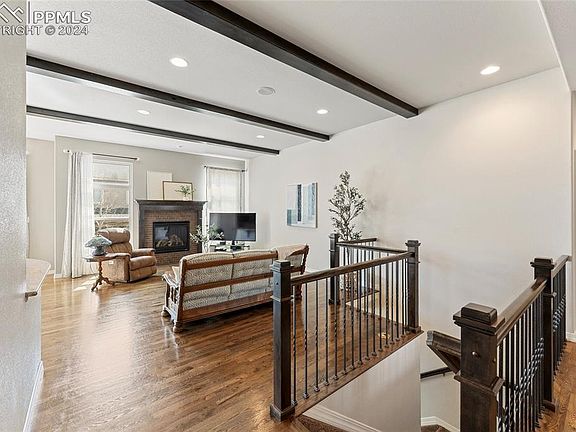 Discover refined elegance in this masterfully designed former model home by Goetzmann, perfectly situated on a prime corner lot in Wolf Ranch. This residence boasts five spacious bedrooms, including a sumptuous Primary Suite, a practical Jr. Suite, and a flexible third bedroom currently set up as an office, all located on the main floor. The heart of the home features an open layout with a formal dining area and an upstairs living room complemented by a gas fireplace, creating an inviting space for relaxation and entertainment. The home is enhanced by decorative ceiling beams and premium upgrades throughout, including soft-close wood cabinets, sophisticated lighting, and plantation shutters in the Primary Suite. The main living area is adorned with solid wood floors, adding to the home’s warm and welcoming atmosphere. The fully finished basement is an entertainer's dream, complete with a bar, a cozy living room with a fireplace, and a full bathroom. Two additional bedrooms in the basement provide ample space for family and guests, while a large storage area holds potential for expansion into more living space. Outdoor living is just as impressive, featuring a professionally landscaped yard with a striking fountain in the front, an inviting outdoor fireplace in the back, and awe-inspiring views of Pikes Peak. The home is equipped with a radon mitigation system in the basement, boasts crown molding, speakers throughout, and a solid wood front door that elevate its overall charm. Additional highlights include an insulated three-car garage, exterior lighting, and an external gas grill hookup on the back deck, ideal for outdoor gatherings. Meticulously maintained, this property seamlessly blends luxury, comfort, and practicality, making it a perfect place to call home. This exceptional home is ideally positioned with convenient access to local shopping centers and a variety of restaurants, ensuring all your needs are just a short drive away.