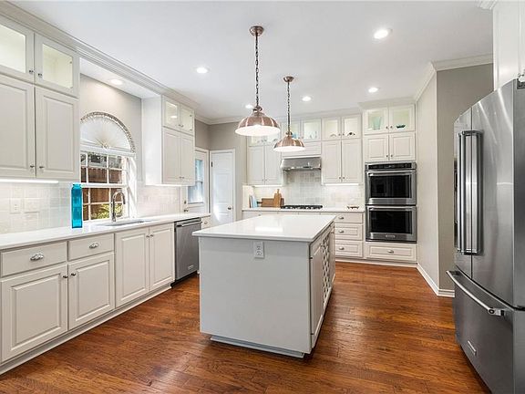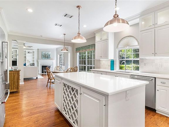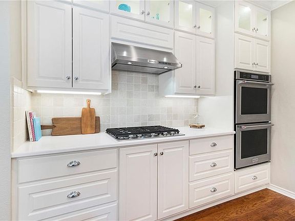 Truly a must see! Private lot with mature trees. Home updates & upgrades include hardwood floors throughout, crown molding, new designer paint/light fixtures/fans, double pane windows w/ solar screens, expansive master w/bonus flex area, office space or 2nd living. Gourmet crisp white kitchen w/quartz counter tops, double ovens, sleek stainless steel kitchen Aid appliances, pendant lighting, soft close cabinets & drawers, built in wine rack. Secluded backyard with covered patio and fan, large grassy area