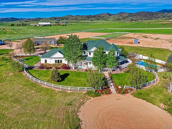 Country equestrian retreat on 35 acres. Charming 2 story with walk-out basement, 5 bd, 5ba, 3-car garage with workshop, office, sunken hearth room, 2 fireplaces, open updated kitchen with granite and large island, pantry, dining room, large rec. room with wet bar. The master suite with soaking tub and shower, Large walk-in closet. Bedroom suites with baths. Mature landscaping with patios, heated outdoor pool, cabana with entertaining area. Fully fenced. Heated 6 stall barn, wash rack, heated tack room w/ bathroom and feed room. Additional 4 car garage storage. 5 paddocks,4 loafing sheds, large outdoor arena and pastures fully fenced. Great location, close to TPC golf course, trails, Carter lake, between Berthoud and Loveland. Enjoy the city lights at night and foothills during the day.