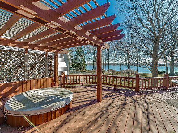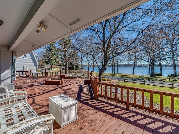 3 BD 2.5 BA 1,956-sq-ft home on all-sports Palmer Lake, 1-acre landscaped tract spans road, 150 ft waterfront, seawall, shallow, sandy entrance. Includes guest house, detached two-car garage w/ upstairs apartment, 20-ft pontoon boat w/ motor, 2-room shed, workshop, storage, 1,000-sq-ft deck w/ 5-person hot tub, planters, pergola. Inside: open-concept foyer, dining, kitchen w/ abundant cabinets, all w/ lake views. Master BD w/ ensuite bath, dual vanities, walk-in closet. Downstairs: finished recreation/family room, workshop/storage room, laundry. 528-sq-ft guest house has own parking area, living room, full kitchen w/ eating area, 1 BD. Garage apartment has living, dining, kitchen area w/ bar seating, bedroom, bath. Another home could be built on the lakeside lot.