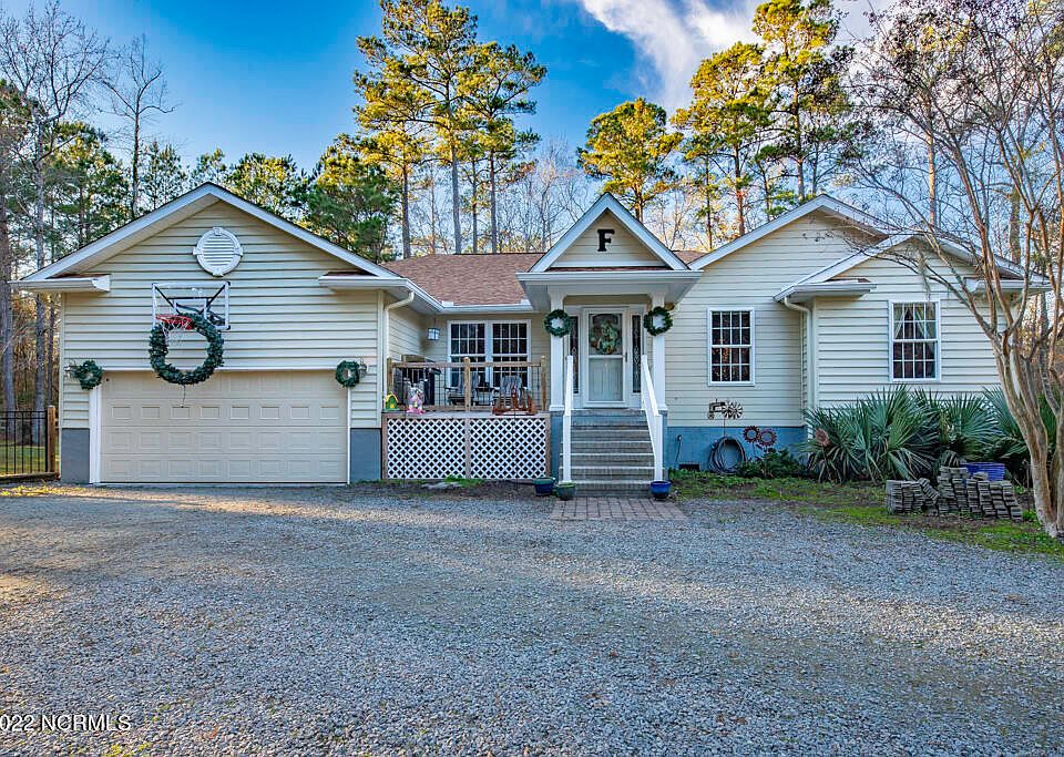Stunning 3-bedroom 2-bathroom home secluded on a tranquil 9.5-acre parcel. A long dirt driveway surrounded by mature trees takes you to the private oasis of a nearly 1900 sqft home with a one-car garage, and a 20x20 detached finished outbuilding with a ramp, electricity, a heat pump, tile floor, windows, and skylights. Enjoy evenings outside looking at the stars next to the warm brick firepit under your pergola. Enjoy your afternoons sitting on your front porch. Inside the bright open floor plan with vaulted ceilings and LVP flooring throughout invites you into this cozy home. Your living room is large enough to host family gatherings and opens to your formal dining area and chef's kitchen. The kitchen boasts granite countertops, stainless steel appliances, tile backsplash, and a gas cooktop with a hood range oven. The new owners will also enjoy the custom built-in shelving and large reach-in pantry. Your primary bedroom is right off of the kitchen and has gorgeous tray ceilings, farmhouse window shutters, an expansive walk-in closet, and a private bath with a walk-in shower. The two remaining bedrooms share a full-sized bathroom with a custom walk-in shower. Your walk in laundry room makes doing laundry less of a chore. Enjoy your morning coffee watching the wildlife from your large, wooden, screened-in porch. This home is perfect for the avid outdoor family and anyone that wants a home with some privacy. 7 miles to the town of Oriental. 18 miles to Minnesott Beach Cherry Branch Ferry easily getting you to MCAS Cherry Point or closer to Crystal Coast Beaches. 30 miles to New Bern with area shopping and restaurants.