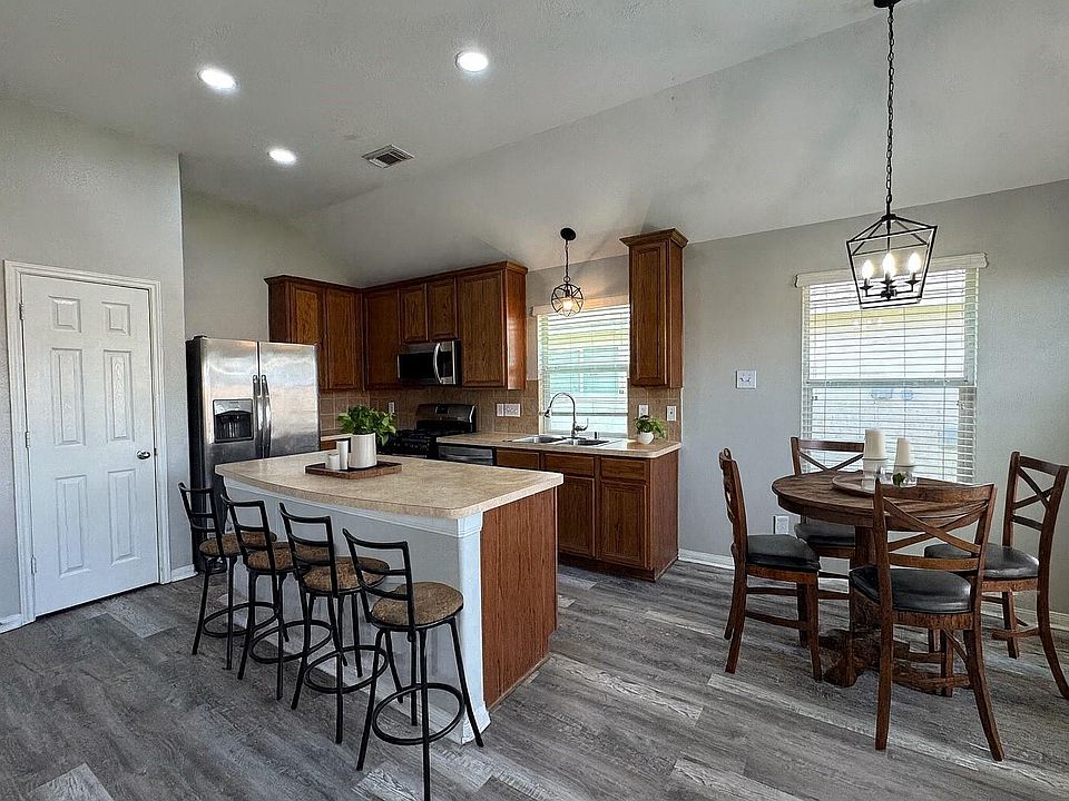 New laminate flooringBright living spaceFenced backyardPlenty of cabinet spaceOpen-concept layout
