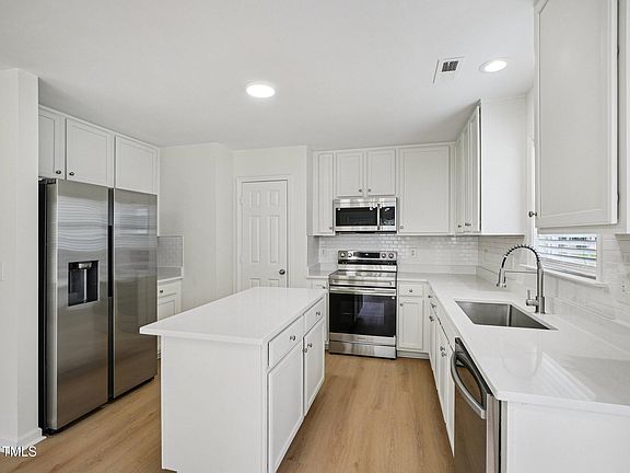 This beautifully refreshed 4-bedroom, 3-full-bath home sits on a quiet cul-de-sac with wooded views and a spacious .25-acre lot, just minutes from downtown Raleigh. Less than 15 minutes to the city center and under 30 minutes to RDU Airport, the location offers easy access to shopping, dining, major roadways, and more - while still providing a peaceful, tucked-away setting. The seller has made significant updates throughout to give the home a fresh, modern feel. New hardwood-look luxury vinyl plank flooring runs throughout the main living areas, paired with brand new carpet in the bedrooms. Fresh interior paint throughout the entire home creates a clean, neutral canvas ready for your personal touch. A brand new HVAC system has just been installed for efficient year-round comfort. The kitchen has been fully updated with bright white cabinets, sleek quartz countertops, a timeless subway tile backsplash, and a stainless steel Samsung appliance package—complete with refrigerator, built-in microwave, electric range, and dishwasher. A large center island provides extra prep space and casual seating, making the kitchen both functional and inviting. The living room includes a gas fireplace with crisp white trim detail and a modern matte black surround. A new ceiling fan adds comfort and style, along with updated lighting throughout the home. Each of the three full bathrooms has been updated, and the flexible layout includes a full bathroom on the main floor - perfect for guests or multi-generational living. Upstairs, the primary suite includes a spacious en suite bath with a garden tub, separate walk-in shower, and dual vanities. Natural light fills the space thanks to generously sized windows, all outfitted with 2-inch vinyl blinds. Additional upgrades include new lighting and fixtures in every room, modern hardware, and stylish finishes that give the entire home a brand new feel - without the wait of new construction. The home is move-in ready and thoughtfully updated with both style and practicality in mind. Whether you're looking for a convenient commute, a peaceful setting, or a fully updated home with space to grow, this property checks all the boxes. Don't miss your chance to tour this incredible opportunity in a sought-after location and the big-ticket items already done.