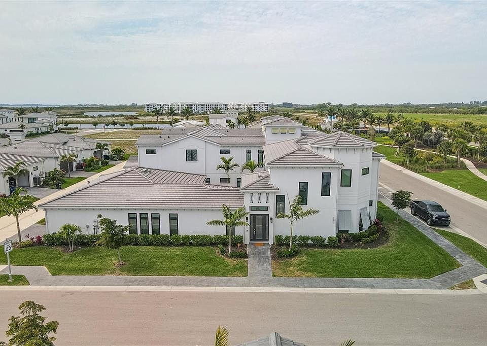 The ONLY 4 bedroom home in Aqua Lagoon, a Gated community with a 4-acre tropical lagoon pool and beach. This unique 2-level Cat Claw Model has Master and 2nd Bedroom suite on main level, and two bedrooms, which share a full bathroom on the 2nd level. Master has a spa-like bathroom, large walk-in closet, walk-in shower, beautiful tub, and dual vanities. Spacious home office on the main floor and open game/bonus room on 2nd level, offer extra spaces for flexible use options. There is a balcony off one of the 2nd level bedrooms, with courtyard views. Owners will enjoy a private salt-chloronated swimming pool. Current owners have added > window blinds throughout, ceiling fans in all bedrooms plus office and living room, added entry chandelier, dining room light fixture, and custom closets in Master and downstairs guest bedroom, plus added a Mosquito X misting system around the pool and garage entry, and monitored security system with 4 cameras. IMG Golf club is a golf cart ride away, the IMG Academy campus is 5 mins away, and plenty of grocery and restaurant options minutes away.