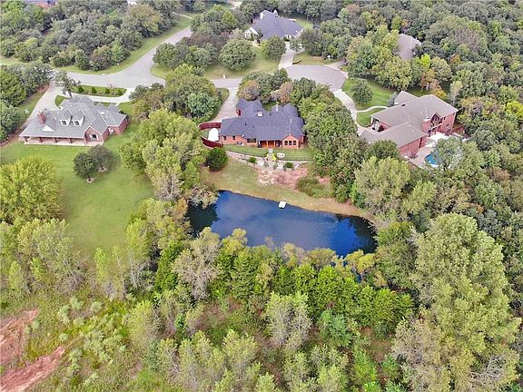 One-of-a-kind, custom built, modern home on a large lot with an outstanding view and a private pond (with a circulator). Entire home has concrete radiant heated floors with a durable epoxy coating that will take any spill! Custom craftsmanship with tall, solid wood doors & cabinets throughout. All new much needed retaining wall and fence was built in back yard. Epoxy floors, interior paint, exterior paint, new hot water tank in 2016. New roof and gutters August 2019. 4 beds, 3.5 baths, 2 dining and a rare step-up library/office. Sit on your back patio and enjoy the pond and green, luscious 1+ acre yard(MOL). Entertain with an open floor plan and magnificent 4 sided fireplace in the center of the home. The large master suite is cozy with a fireplace and his and hers closets. Easy access to I-35 & Lake Arcadia. Check it out before it's gone!