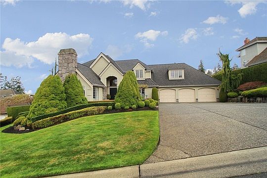 Striking View Home. Never on mkt. Great Sound/Mt views, new 50-yr roof, newer furnace/water htr. Grand staircase sets theme for 3,618 sq ft of elegance. 4 beds/2.5 baths, lg 5-piece view master, lg view kitchen w view eating, lg deck off kitchen, cozy rec room, formal dining/living rooms, cozy den, 1/2 bath, laundry w sink/storage. Grand + back stairs to lg top floor, huge 2nd rec room, three additional beds, 2 full baths. Built-ins throughout. Lg 3-vehicle garage w storage. 2 fps. Great yard.