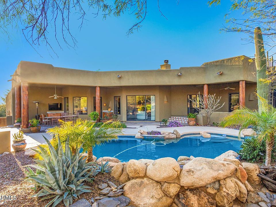 Nestled into the side of Black Mountain at the end of the cul-de-sac this fully furnished home is a rare-find. Boasting beautiful mountain views this cozy home features an open floorpan allowing for an easy flow between the great room, kitchen, formal dining and living room; perfect for entertaining and everyday living. The split owners suite and 3 additional guest bedrooms allow for plenty of space for family and friends. Relax and enjoy the private outdoor spaces whether in the pool, sitting by the cozy fireplace or on your view deck watching the amazing Arizona sunsets.