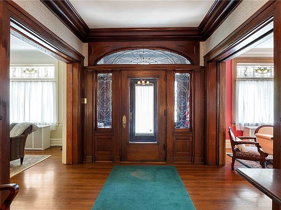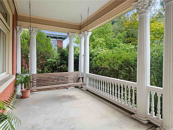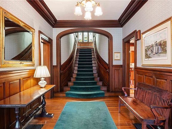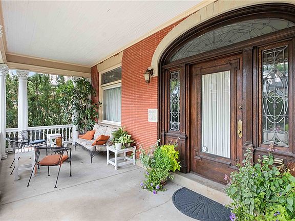 This stately and elegantly appointed Highland Park home features a beautifully refinished wood and leaded glass entry door, gleaming quarter saun oak hardwood floors, pocket doors, wainscoting, crown mouldings, coffered ceilings, builtins, an artistically designed beamed ceiling in the gracious Dining room, unique mantels in every room, a magnificent butterfly staircase w/18 stained glass windows believed to be designed by the prominent Rudy Brothers Glass Firm. The updated EIK offers custom maple cabinetry, stainless appliances & subway tile backsplash. Enjoy entertaining on the expansive front porch or have a morning coffee on the relaxing back porch overlooking the gardens. Carriage house (AS-IS) offers 3 car grg. and could be a great space for a studio/office. The exterior of this lovingly maintained home has been newly painted. The huge lower level is partially finished and includes a powder room. Walking distance to Bryant St. shops/dining, HP Reservoir gardens & park.