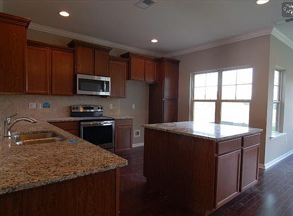 - RoomKitchenFeatures: Granite Counters, Kitchen Island, Recessed Lighting, Cabinets-Natural, Floors-Laminate, Backsplash-Tiled