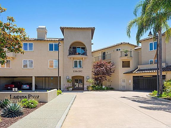 Welcome to 591 Laguna, a SINGLE LEVEL stunning residence nestled in the heart of Carlsbad, where luxury living meets coastal enchantment. This exceptional property offers an array of amenities that redefine comfort and convenience, providing you with an unparalleled living experience. This Beautiful SINGLE LEVEL, highly upgraded, beautiful wood floors, crown moulding, custom built ins, plantation shutters, stainless steel appliances, stackable enclosed washer/dryer, a pacious Primary Suite w/ oversized bath, walk in closets & many more upgrades. Private deck w/ treetop and pool views overlooking State Street. Completely furnished and MOVE IN READY! Gated building with only 21 units. This Resort-Like Development in Carlsbad Village is next to wonderful fine-dining options, coffee shops, shopping, train station and the beach. HOA FEES include -all exterior maintenance including roofs, landscape, painting, fire insurance, Elevator for Complete Handicap Accessibility, a game room with fireplace and partial Kitchen, a gymnasium, Pool and Spa.