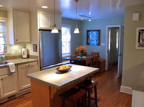 a 4 year new hot water heater, wood like laminate flooring installed June 2012, oversized pass-thru window created to allow kitchen, living room & dining room to have a more open plan, some new int/ext paint, wired for 5-1 surround sound in living rm w/ outdoor speakers on deck and a custom built island in kitchen. Home also has tile floors in the kitchen and baths, a fenced in back yard and is private, surrounded by hardwoods. Enjoy a rocking chair front porch, or a cook-out on the oversized back deck. Very convenient location to shopping, schools, etc.