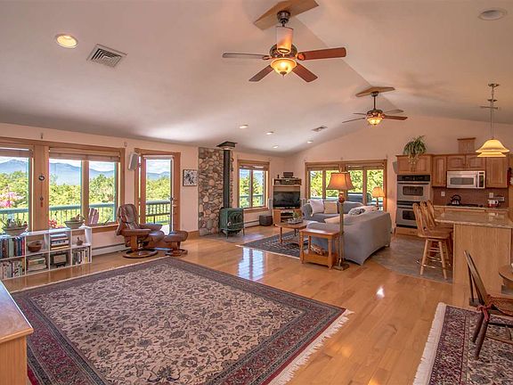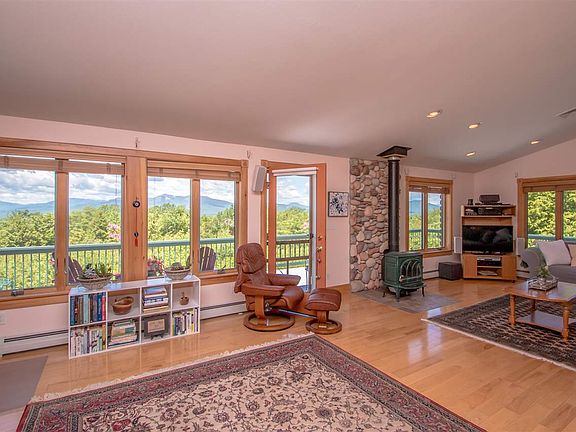 SPECTACULAR VIEWS, PRIVACY AND LAND! Surround yourself with panoramic breathtaking mountain views from this rare slice of Heaven on Earth. Expansive deck offers a 2nd story perch to admire everchanging views. A 3-sided glass sunporch gives you a delightful spot to immerse yourself in nature to watch wildlife visitors throughout the seasons. Set on 20 private acres, this rare hilltop delight is well built and designed with openness and the use of natural light. Quality construction is enhanced by details such as hardwood and tiled floors, natural wood trim, center stone hearth and stone bathroom floors. Cathedral ceilings and extensive windows in great room open to kitchen and dining areas and provide spaciousness along with impressive functionality. Kitchen upgrades included gorgeous granite counters and stainless-steel appliances to compliment meals and entertaining. This 3-bedroom log sided ranch was recently upgraded to include a beautifully finished walkout lower level, bay windows and Mt Views. Enhanced with tiled floors, a 2nd full kitchen, living room, den, bathroom and office. Laundry and extra storage room allows much versatility of space for your lifestyle options: primary or vacation, space for in-laws, guests, home business or other. Convenient to Rt 16 for commuting and close to amenities both north and south, Madison includes access to town sandy beaches on beautiful Silver Lake and located equidistant to Mt Washington Valley and the Lakes Region of NH.
