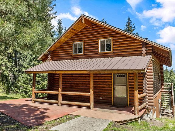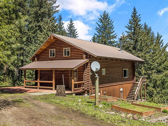 Sweet log home set on 8+ private mountain view acres at the end of a dead end road yet close to town. Two car garage and a detached 35X25 metal detached metal garage/shop. Very large kitchen with ample counter space & cabinets, great for gatherings. Big living room with wood burning stove & and a mountain view deck. Vaulted ceilings on the main floor. Main floor mud room/utility room as well. Exposed wood beams, tongue and groove ceilings. The basement is your rec room or additional sleeping area or play space. Second floor has two bedroom and master loft space. BIG upside to enhance your view by topping or removing trees. Firewood shed, pump house on site. Hike, chill and party or ride all your toys and it's all here.