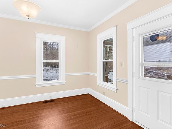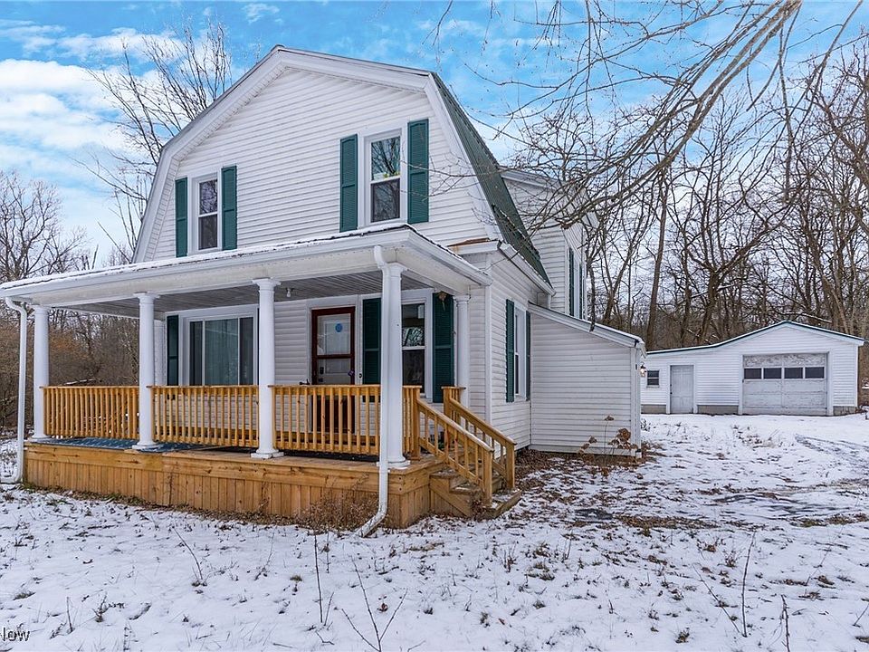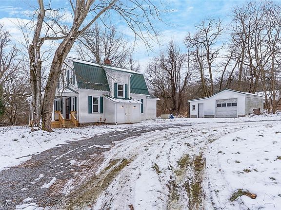 5910 Chestnut Ridge Rd, Hubbard, OH 44425, Charming Country Farmhouse in Hubbard School District. Nestled in the country on a spacious lot, this inviting farmhouse offers 3 bedrooms and 2 full bathrooms with classic character and modern livability. Enjoy peaceful rural living with a welcoming front porch, vinyl siding, and a metal roof, plus a 1.5-car garage and wrap-around driveway for easy access and ample parking. Enter from the side porch into a cozy sitting area with beautiful hardwood flooring that flows throughout the home. A graceful staircase leads to the second level, while the living room at the rear provides relaxing views of the backyard. The dining room connects to the kitchen, which features white cabinets, a pass-through with open upper wall, solid surface countertops, and white appliances, creating a warm and functional space for everyday living. On the main level, a bedroom or office off the dining room offers versatile space and convenient access to a full bathroom. Upstairs, you’ll find two additional bedrooms, each with nice closet space; one bedroom includes its own classic shaving sink, a charming period detail. The traditional full bathroom boasts two vanities and a clawfoot tub, adding character and historic appeal. The full basement provides excellent storage and utility space, making this property flexible and practical for modern needs.
