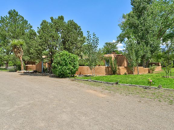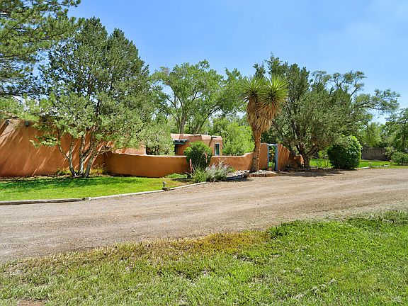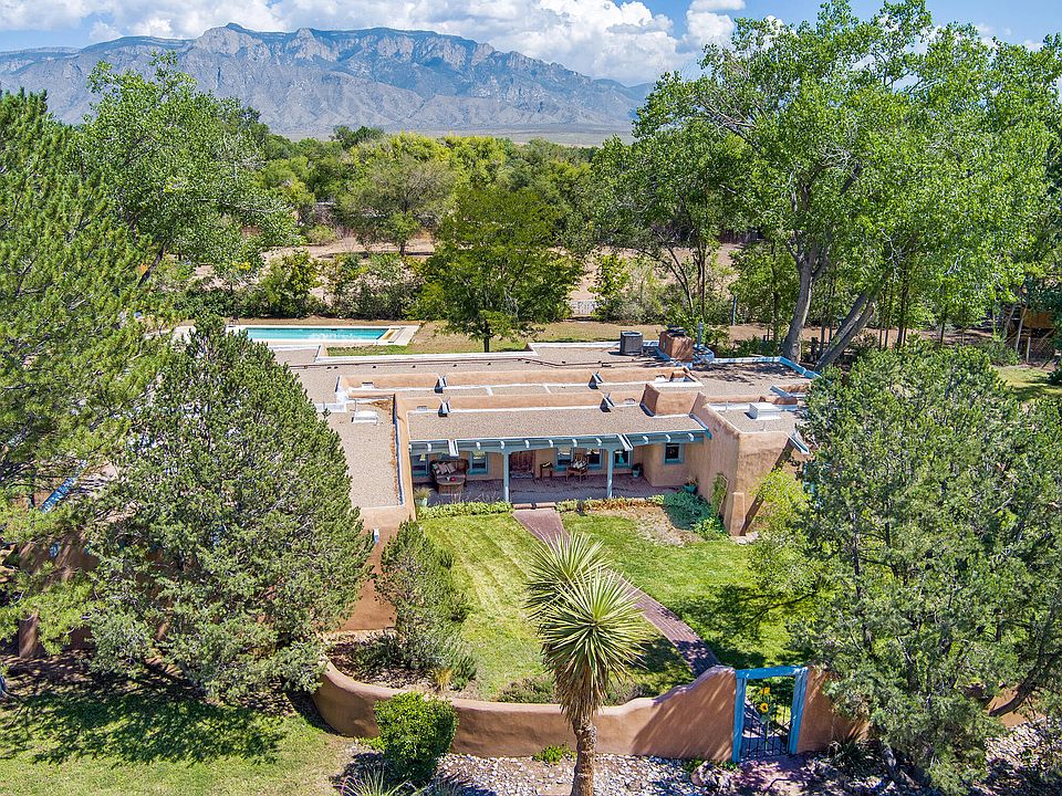 Classic Corrales Hacienda set on 3.4 acres with sweeping Sandia Mountain views & timeless adobe design. This 4+bedroom residence offers a brilliant floor plan with 2 living areas, a family and formal dining room, enriched by viga ceilings, wide plank wood & Saltillo tile floors, handcrafted details & Pella windows. 3 fireplaces, bring warmth & character throughout. Outdoors, shaded portals, pool/spa, kiva patio & grill invite gatherings beneath mature trees & open skies. Irrigated grounds stretch toward the mountains, while a substantial 6-stall barn, hay/tack storage & a versatile loft expand the possibilities. Dual wells serve both home & land.Set along a quiet country lane in coveted east Corrales, rare property, blends historic adobe craftsmanship, with limitless potential! No steps