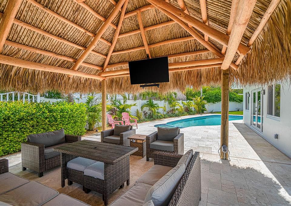 Great home in the heart of Imperial Point-3 bed/2 bath, split floor plan & 2 car garage equipped w/ Tesla charging station & overhead storage. Resort style backyard features a furnished tiki hut w/ mounted television & additional electrical outlets. Enjoy the luxury of a heated saltwater pool & spa, perfect for year-round enjoyment. Oversized, fully fenced yard provides ample green space & a shed for extra storage. Beautifully updated kitchen & flooring offer a fresh and contemporary feel. Impact windows & doors with newer roof. Dedicated laundry room. Yard/pool maintenance included-lawn uses well water for added savings! Tenant has option to activate existing Ring & ADT systems. Located in a quiet neighborhood w/ sidewalks & conveniently located to beach, highway, restaurants & shopping.