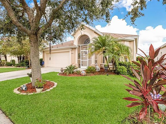 MOVE IN READY & BEAUTIFUL. NO CDD!!!! LOW HOA!!! This move in ready home is impeccably maintained and located in the lovely community of Covered Bridge Estates, a deed restricted and highly sought after neighborhood. Super charming, light and bright 3 Bedroom + Den , 2 Bath home offers fresh paint, updated lighting. Open floor plan with privacy for bedrooms, open lake views and your own hot tub with lighted lanai for those breezy Florida evenings. Great curb appeal with double front door entry that is screened in and mature landscaping with an umbrella cut oak tree. Neighborhood has a very nice community pool, fitness center, tennis courts, playground and park, and the community is tucked away yet easily accessible to 75 for trips to Tampa, St. Pete, Clearwater and Sarasota.