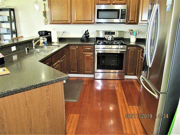 Stunning, panoramic view of the mountains and Knik Arm.This lovely townhouse style condo has many upgrades including newer appliances, new furnace, Rinnai on demand HWH and air conditioner. Kitchen has solid surface counter tops and a gas stove. Trex decking on front and new deck on back of unit. Convenient built in work space in the garage. Move in ready for a new family to enjoy.
