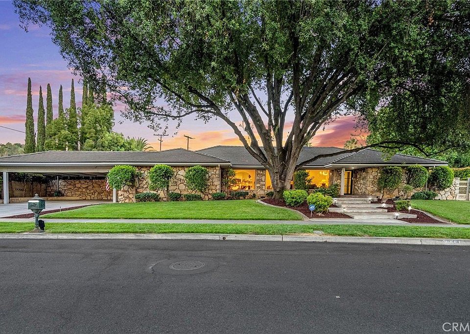 HAWARDEN HILLS- HISTORIC VICTORIA AVENUE- Located on a quiet frontage road off of one of Riverside's most storied and nostalgic avenues is this turn-key Mid-Century Ranch home sensitively updated for gracious living! Large formal living and dining room with 3 massive plate glass windows framing views of Victoria and the hills and mountains beyond; Massive island kitchen with custom cabinetry, porcelain solid surface countertops, Ilve Nostalgie™ 60" Italian Range, Side by side stainless steel refrigerator and bar that seats eight; Family room with 2 sets of custom iron divided-lite French doors leading to the back deck and raised hearth fireplace; Large Primary suite with private bath and walk-in-closet; Three secondary bedrooms and a total of 2 1/2 Baths in the main house; Fifth bedroom and fourth bath in the detached pool house with dry sauna and outdoor shower adding an additional 500 square feet for a total of 3,993! Expansive covered wood deck overlooking the refreshing pool and lush lawn of the back yard, Lots of brick decking around the pool ideal for entertaining; Over-sized 2-car carport with ample off-street driveway parking and room for expansion or development of an enclosed garage if desired! A very special home in an absolutely perfect and unique setting!