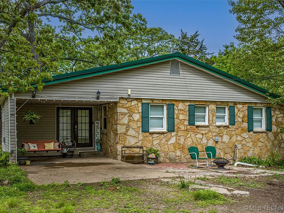 It’s all about LOCATION! This versatile property is 4.81 acres along the Neosho River. Charming 3 bedroom, 2 bathroom home. The living room features vaulted beam ceilings, original hardwood floors, rock fireplace, and amazing views of the river. Large eat-in kitchen with new laminate flooring that continues down the hall. Wake up with a stunning view of the river in the primary bedroom. Primary bedroom has original hardwood floors, pretty stone wall, multiple windows, door to backyard, and direct access to a huge laundry room . Guest room features new laminate flooring, walk-in closet, and a private bathroom. Spacious 3rd guest room. Main bath updated with cedar plank walls, newer vanity, large tub, and separate shower. Home has a metal roof and thermal windows. 50x30 shop with electrical and wood burning stove for heat in the winter. Secondary outbuilding. Stroll down to the river to fish, swim, or enjoy the warm Oklahoma sunsets. Property is located at the end of the road and offers plenty of privacy. Must have a confirmed appointment to show.