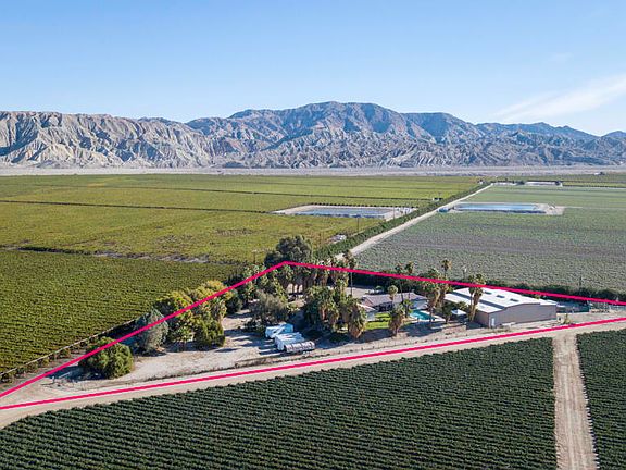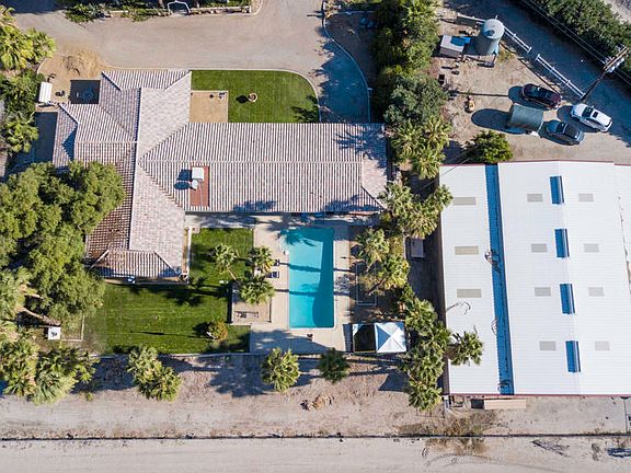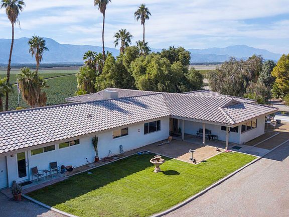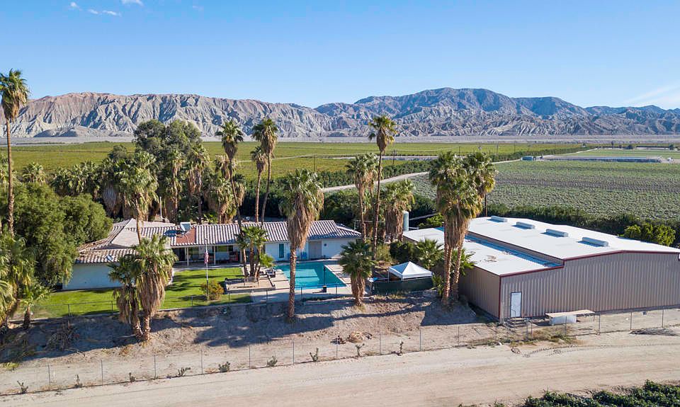 Private, peaceful and magical. Step back in time at Pineapple Hill Ranch, a beautifully preserved, cool, custom, 1968 ranch style pool home. Situated on a two acre elevated parcel, with stunning 360 degree views of fields and mountains. Pineapple Hill Ranch has the potential as an Event Site or STVR property with it's south facing, pool with spectacular views. Easy flow floorplan with many original features such as closet built-ins, built-in desks, original tile in bathrooms, plus saloon style toilet room doors, and 2 sets of pocket doors. The updated kitchen with it's passthrough to the dining room, offers stainless appliances, original cabinets, and counter tops that are a composite of copper quartz and recycled glass. There are 4 bedrooms, 3 bathrooms, a family room, a large office/laundry room, and a sprawling, sun lit great room, and two bonus rooms which could possibly raise your bedroom count to 6! Attached 2 car garage. The 6400 sf., permitted and insulated warehouse is 80 ft. x 80 ft., features 2 large roll up doors, 5 regular entry doors, 16 skylights, and is divided into 3 large spaces with peak ceiling height of 15 ft. 11 inches. Pineapple Hill Ranch is near Hwy 86, and approx. 10 minutes from Jacqueline Cochran Airport, HITS showgrounds, Thermal Race Club, and the Tower gas station/market. There is a private well +5,000 gal storage tank, IID for electric service, and a septic system.
