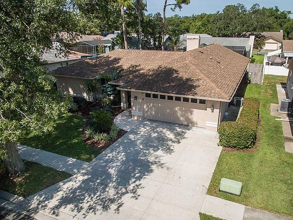 ROOM FOR A POOL!! ONE OF A KIND!!! This 4 bedroom, classroom/study, 3 bath split floor plan home is nestled on a quiet cul de sac in the sought after community of River Crossing. Freshly painted throughout, this home is immaculate and move in ready. As you walk through the front door into the foyer, you step onto the stunning Brazilian cherry hardwood floor. This gorgeous flooring can also be found in the dining room and master bedroom adding elegance and warmth. The living room has a beautiful picture window and 2" wood blinds. Off of the dining room the large master bedroom has a remodeled en-suite and air conditioned walk-in closet. French doors lead out to the enclosed year round air conditioned and heated lanai. Adding to the uniqueness and beauty of this home is the flagstone wood burning fireplace in the family room which highlights the center of the home making it a warm and cozy gathering place. Pocket sliding glass doors open up into lanai which offers you year round extra living space. Skylights add plenty of natural light and have shutters that you can open and close when needed. Spacious eat-in kitchen with breakfast bar has solid oak cabinets, an appliance garage, lazy susan, large pantry, new dishwasher and stove. Laundry room is conveniently located off the kitchen. The hallway off of the kitchen/family room leads to your 3 bedrooms, classroom/office and 2 bathrooms. The 1st bedroom has a walk-in closet. The classroom/study has a closet for all your classroom or office supplies or it can be used as a 5th bedroom. Sliders leading out to the patio make for a perfect study or work environment. Bedrooms have 2" wood blinds. Beautifully landscaped large backyard is fully fenced with cypress fencing. There is enough room for a pool. See attached drawing. You are conveniently located near shopping, hospital, Veterans Expressway, I75, Clearwater, Tampa, the beaches and much more. This home is a must see, won't last long!!