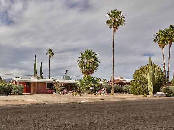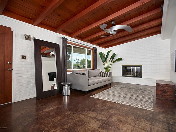 Mid century modern gem offers unique touches while providing the best of a central Tucson location. Large desert rocks & cacti provide a beautiful welcome for the front landscaping. Living room w/wood beamed ceilings is accompanied by a large picture window & fireplace w/painted brick wall. Smooth finished concrete floors throughout provide clean look. Dining room off kitchen & entry to large bonus AZ room. Two guest bedrooms along w/updated full guest bath w/floating vanity are down the hallway. Master bedroom w/modern fan has a 3/4 bath. Walled in backyard is a perfect private setting for enjoying desert nights w/ detached covered patio, grass lawn, & fire pit. Windows upgraded throughout for extra energy efficiency! Single space carport and laundry room just off kitchen door. Property is complete with security camera system wired in place. Fridge stays with the property. Don't miss out!