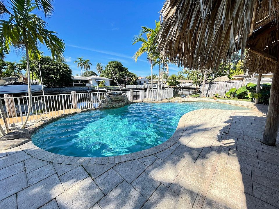 Experience true South Florida living in this updated 3 bedroom, 3 bathroom waterfront home with ocean-access canals (fixed bridges). Enjoy your own private retreat with a pool, hot tub, tiki hut, and dock right in the backyard. Owner maintains the pool, hot tub, and yard for easy living.