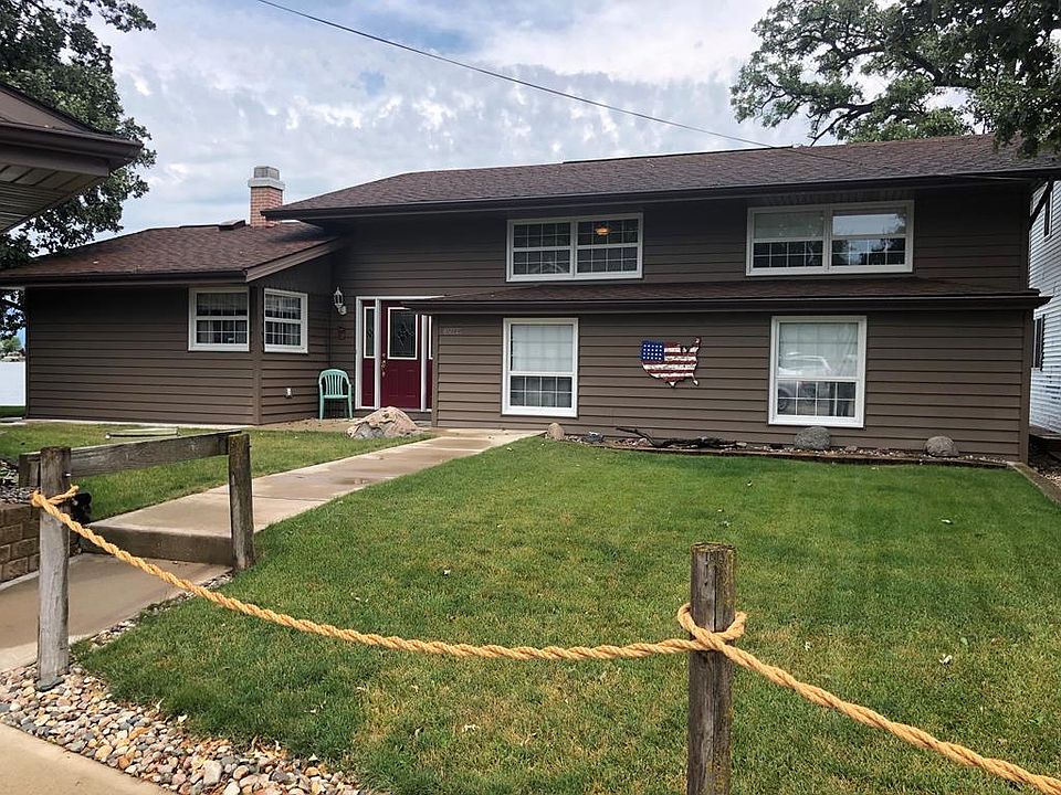 Take this rare opportunity to own over 125' of Twin Lakes lake frontage with a level approach to the lake, a shaded yard, and a gorgeous view up & down the entire lake. Solidly built well-maintained home featuring an open kitchen and dining w/unique fireplace & sliding doors opening to maintenance free deck at lake side. Three bedrooms, one with sliding doors to lakeside deck, one full bath and one half bath, large living room with sliding doors to deck competes the main level. LL family room with daylight windows, large utility could be rec room, and storage galore. Even a sauna! Detached insulated garage with the perfect entertaining area complete with kitchenette and 3/4 bath. You'll love hosting friends and family separate from your home. 2 maintenance free docks with this property.