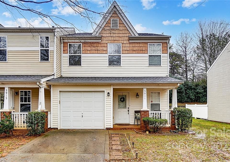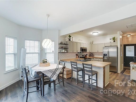 Welcome to Stonebrook, a gated townhouse community in South Charlotte. 2 bed / 2.5 bath END UNIT with a one car garage and a rocking chair front porch. This home has been updated with new paint and flooring throughout. The open floor plan is inviting and bright with lots of windows and a BAY WINDOW in the dining area. The kitchen features newer STAINLESS STEEL appliances, refrigerator included, white SUBWAY TILE backsplash, painted cabinetry, and a beautiful butcher block countertop. Additional features are solid stair treads, neutral paint throughout, new vanity in the half bath, and back patio is private with trees. The upstairs features 2 LARGE PRIMARY SUITES with vaulted ceiling and both bedrooms having an ensuite bathroom, making this perfect for roommates or guest. This community is a short distance to restaurants and shopping, conveniently located to I-77, South End breweries, South Park, 10 mins to uptown and easy access to 485. Don't miss it!!