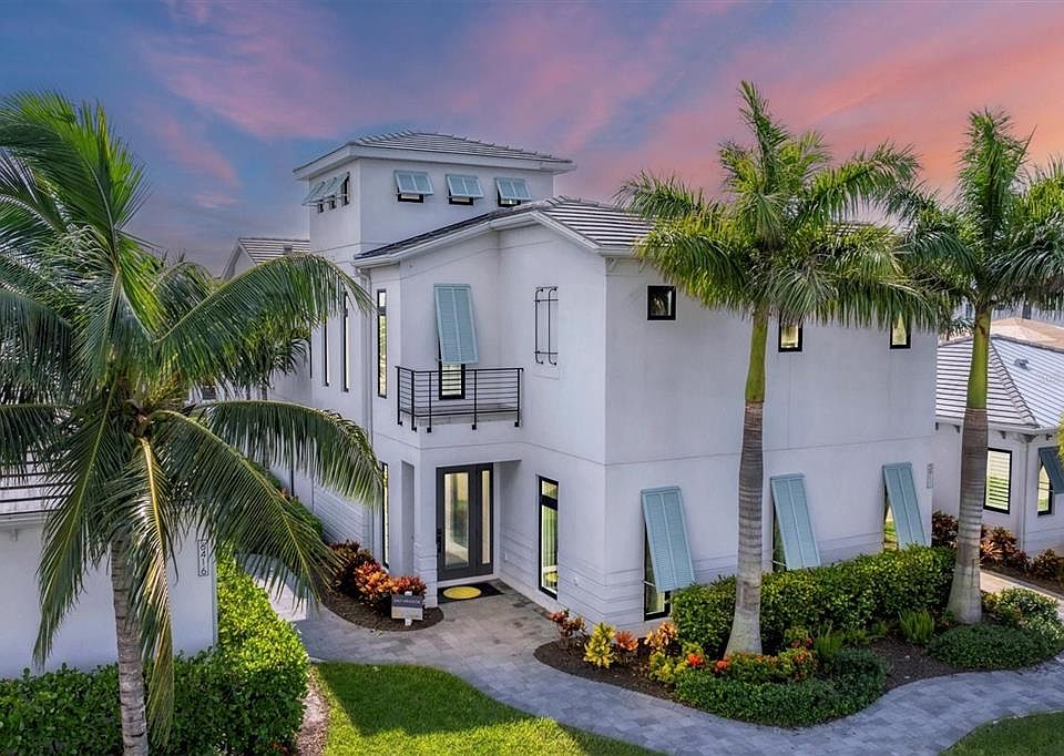 FURNISHED MODEL HOME, carefully selected by John Fleming Design includes all the trimmings and luxury finishes! On the main floor, you will find a two-story entry foyer, elevator, separate living space adorned with billiards table and seating, nook at stairs perfect for a dry bar, formal dining space, full bathroom, spacious family room open to the kitchen equipped with commercial grade refrigerator, blackish stainless steel built-in appliances, backsplash, farmhouse sink and hood exhaust, warming drawer, Quartz tops, custom wood cabinets with soft close drawers, walk in pantry and large eat-at island. Adjacent to the family room is a well-equipped home office with barn doors at entry. Wood stairs and contemporary railing leads you upstairs to a loft area, ideal for a reading space or another TV area, laundry room with upgraded washer/dryer, two secondary bedrooms with walk in closets and e-suite bathrooms, and a primary bedroom with large walk-in closet adorn with extensive custom shelving and bathroom with double vanities, garden tub, walk in shower with dbl rain showerheads. Outside you will enjoy the salt water pool with decorative fountains, automated screens enclosing two separate areas of the lanai, and a bbq grill built-in outdoor kitchen feature. Other extras include all IMPACT windows/doors & window treatments, numerous ceilings have beautiful details, natural gas cooking & tankless gas water heater, gorgeous light fixtures & all LED lighting, surround sound, two of the upstairs bedrooms enjoy private balcony access, upgraded interior detailed 8' doors, wood shelving in all closets & pantry. Too many upgrades and special touches to list! Aqua Lagoon is a gated community with paver brick driveways & walkways, with an amazing Lagoon style pool, and owners appreciate maint free lawn care, wifi/cable service included in HOA dues. Located minutes from IMG Academy, IMG Golf Club, and short drive to Bradenton beaches, and shopping.