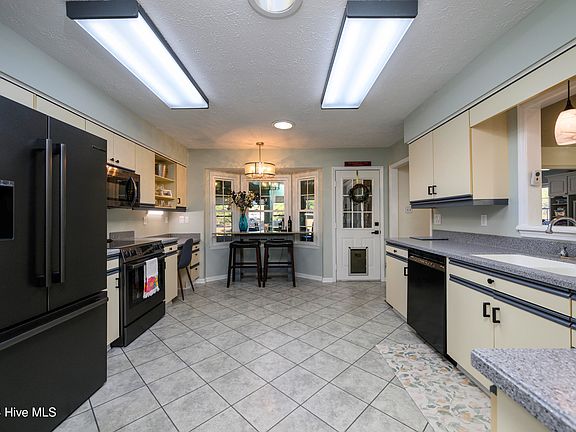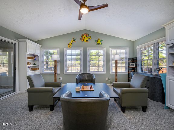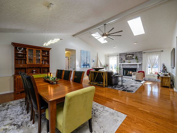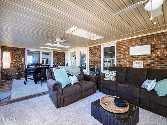 Experience the charm of Fairfield Harbour at 5911 Santo Domingo Court—a captivating brick ranch home nestled in one of New Bern's most esteemed golfing, fishing, and boating waterfront communities. This three-bedroom, two-bathroom abode marries classic allure with modern flair. Come inside to discover a well-appointed kitchen to your left, boasting updated Bosch appliances and a custom light fixture that enhances its polished aesthetic. To your right lies a spacious living room graced with vaulted ceilings, original hardwood floors, and a cozy gas fireplace that invites you to relax and unwind. Flowing seamlessly from the living room is an expansive dining area, ideal for hosting dinner parties or enjoying everyday meals. Adjacent to this space, the den offers built-in bookshelves and vaulted ceilings, reinforcing the home's airy and open feel. Wall-to-wall windows in the heated Carolina Room flood the space with natural light, offering serene views of the lush backyard, the community green space, and beyond. The back door to the Carolina room opens to the deck and patio area, perfect for outdoor entertaining or quiet evenings under the stars. Retreat to the luxurious primary suite, a spacious sanctuary designed to accommodate a king-size bed with ample room to spare. The newly renovated ensuite mimics a day spa, complete with heated floors, a luxury style walk-in shower, and a sizable walk-in closet to easily organize your attire. On the opposite side of the home, find two additional bedrooms and another full bathroom, conveniently positioned for guests. This residence boasts numerous updates, including newer skylights from August 2024, a 2018 roof, a 2024 HVAC system, and more. The outdoor living spaces of this home are equally impressive, featuring an open-air patio, a spacious deck, and a fire pit—all overlooking the picturesque green space and exercise path. The two-car garage offers additional storage with extra cabinets. Call us to schedule a tour today!