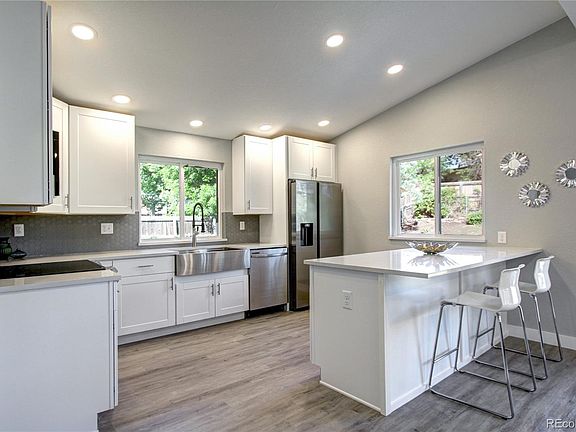 Unique mid-Century Modern in Littleton. The beautiful home has been completely remodeled and fully permitted. The kitchen is bursting with natural light and boasts new cabinets, quartz countertops, tile backsplash and new stainless steel appliances. There are three bedrooms on the main floor and one full bathroom with all new fixtures and tile. This home has all new texture, paint, vinyl flooring and trim throughout. The electrical and electrical panel are newly updated, along with the plumbing. The basement is finished with new drywall, texture paint and carpet. There is a 3/4 bathroom with all new fixtures and tile. There are also two bedrooms, one with an egress window. The windows, exterior paint and roof of the home are all brand new. The property has been professionally landscaped with all new sod in the front.