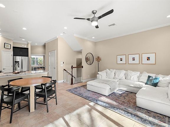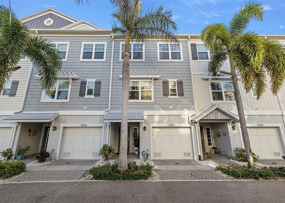 Welcome to The Cove at Loggerhead, a gated waterfront community where luxury meets nature. This beautifully townhome is nestled against a tranquil nature preserve, offers direct access to walking trails and lush greenery. The ground-level, paved back patio is perfect for relaxing in the afternoon shade or taking your dog for a walk. Enjoy the convenience of a two-car tandem garage with ample storage for a golf cart, bicycles, and kayaks. The well-lit foyer, with tiled stairs leads to an open-concept second floor. Here, you’ll find a contemporary kitchen with 42” cabinets, granite countertops, and stainless steel appliances flowing seamlessly into a bright living room with tile flooring and a screened-in balcony overlooking the preserve. The second floor also includes a spacious bedroom and a full bath. On the third floor, the oversized primary suite features an ensuite bath with dual vanities, a walk-in shower, and a large walk-in closet. Two additional bedrooms, a full bath, and a laundry room complete this level. The Cove at Loggerhead offers a pool, marina with Gulf access, Tiki Bar, BBQ areas, and Captain’s Lounge. This Townhome has a brand new AC. This prime location is just minutes from the beaches, downtown St. Petersburg, and Tampa International Airport, making it a perfect blend of luxury and convenience.