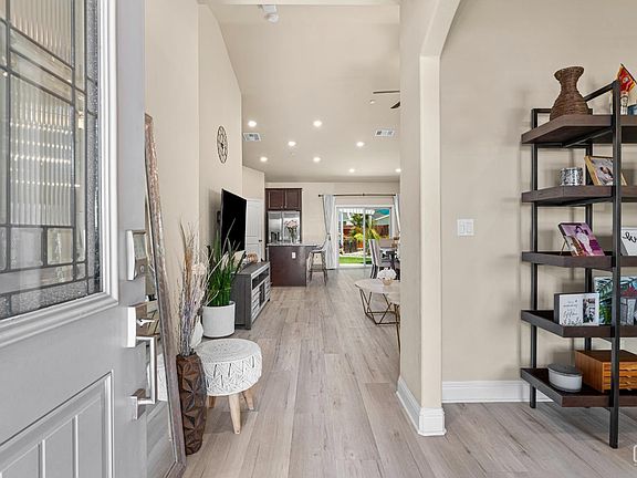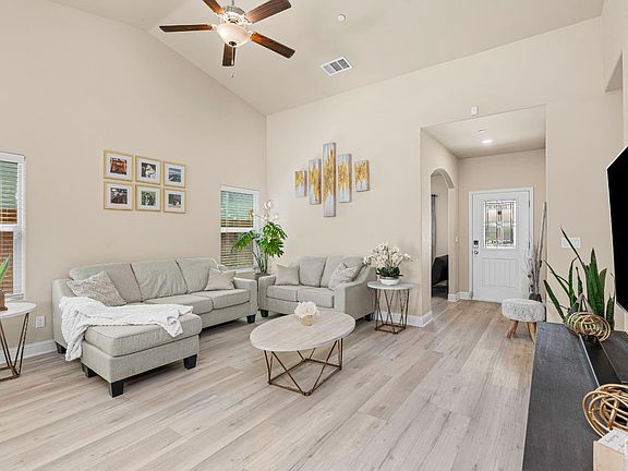 Step into this impeccably maintained 3-bedroom, 2-bath SW residence, featuring a versatile bonus room ideal for a home office, den, or guest retreat. Spanning 1,602 sq. ft., the thoughtfully designed floor plan is enhanced by soaring vaulted ceilings, creating a bright, airy ambiance that feels even more expansive. The open-concept great room flows seamlessly into a chef's kitchen adorned with granite countertops, a generous center island, breakfast bar, and abundant cabinetryperfect for both everyday living and elegant entertaining. Throughout the home, neutral tones and luxury vinyl plank flooring offer timeless sophistication. The fully landscaped backyard is a private sanctuary, complete with a patio slab, pergola, storage shed, and lush, meticulously cared-for greenery. A true gem that blends comfort, style, and pride of ownership.