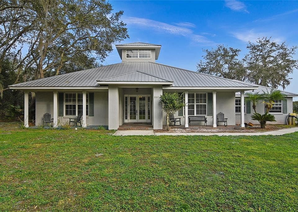 Motivated Seller!! Improved Price!! Lovely, nearly 5-acre lakefront home with expansive views awaits you. Some of the notable highlights are: completely fenced, automatic driveway gate, solid-surface driveway to the house and barn. Additional features include parking for RV, guesthouse, barn with stalls, turn-out pasture, lake with sunrise views, fire pit and swimming pool. This close-to-town estate features a main house with three bedrooms and two baths with a metal roof and an oversized two-car garage. The main house is Key West-style with a windowed Cupola roofline allowing cascades of sunlight to rush in from above. The open floor plan home has cathedral ceilings with paddle fans that gently move the air about the home. French doors bank the rear side of the home as they open to a beautifully inviting pool with screen enclosure and water feature. The sound of water is echoed back into the home, giving a peaceful serenity that abounds. The open eat-in kitchen with newer stainless steel appliances and solid surface countertops express a Florida style that is always open to entertaining. The master bedroom is generous in space and looks out to the pool area via yet another set of French doors. A walk-in closet, dual sinks, and separate shower/tub are nice touches. Opposing the master are two other guest suites. Each guest suite has its own amount of ample closet space, large windows, and wood flooring. One of the guest suites is en-suite which features a custom blue tiled shower as well as around the water closet and pedestal sink. A large utility room lends to yet another pantry/storage area with utility sink. Leading out there is a tasteful fire pit constructed of natural stone and a solid stone-built barbecue. As you venture around the walking path, there is a solid block barn with large sliding doors on both ends. This multipurpose barn, measuring approximately 35'x35', is large enough to drive in large equipment for storage or overnight housing for horses and any of your four-legged friends that might need a place to stay. There is electricity in the barn as well as hot/cold water with washing stations. Towards the front of the property sits your rustic guest house. This guesthouse is such a nice addition to the property as it features a large wood deck, one bedroom, one bathroom, a kitchen, dining area, living room, interior laundry room and separate well water system. As a bonus, the guesthouse has additional storage on the side. The property abuts Lake Chaudroin. There is approximately 300 feet of shoreline on the lake. The private lake is approximately 10 acres of surface area and offers wonderful views from the property. This incredible lake house retreat is available now... do make your appointment soon.