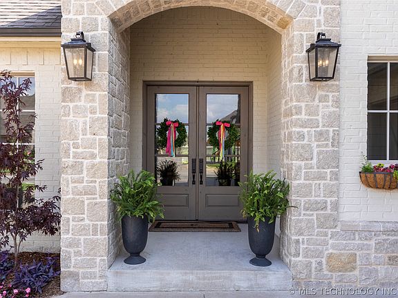 Gorgeous and gated in Jenks SE! Amazing floorplan in the Tradition. Great for family and entertaining! Double door front entry and office with large window. Open kitchen with large island and walk-in pantry opens to living with custom built-ins surrounding fireplace. Designer paint colors, lighting, and finishes throughout! 2 bedrooms and 2.5 baths downstairs, powder bath, mudroom & laundry room with marble countertops and additional desk work space. Upstairs large game room and home theater. Professionally landscaped with large picture windows framing the built-in grill and covered patio with living area and large outdoor fireplace!