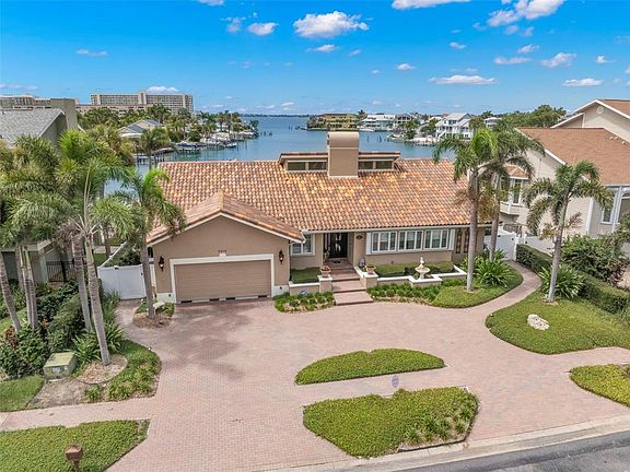 Discover the lifestyle you've been looking for in this well elevated single-story waterfront home, located within the gated waterfront enclave Pasadena Yacht & Country Club. This "high and dry" residence has been flawlessly updated to offer a harmonious blend of elegance and modern amenities. Upon entering, you'll quickly be captivated by the exquisite gourmet kitchen, a chef's dream featuring a spacious island, state-of-the-art Subzero appliances, a European enamel natural gas stove, and premium solid wood cabinetry. Adjacent to the kitchen, wine aficionados will appreciate the custom-designed wine bar area, showcasing storage for hundreds of bottles—perfect for curating your private collection. The home's split bedroom layout ensures privacy, with the expansive primary suite offering a peaceful retreat. The remodeled en-suite bathroom is your personal spa, featuring dual vanities, a separate shower, and a charming claw foot tub. Outdoors, immerse yourself in resort-style living. The covered outdoor kitchen and seating area are ideal for entertaining, providing stunning views of Boca Ciega Bay while being safeguarded by electronic hurricane shutters. Relax in the inviting pool with its serene waterfall features, or unwind in the pergola-shaded jacuzzi, perfectly positioned to enjoy the iconic Florida sunsets. Additional features of this exceptional property include hurricane windows and doors, tile roof, a natural gas generator, a dock and boat lift, remodeled bathrooms, and a spacious circular paver driveway. Embark on a lifestyle of unparalleled luxury and convenience in this European-inspired home, where every detail is crafted to perfection. Schedule your private viewing today and step into a world of sophistication and style in the Pasadena Yacht & Country Club.