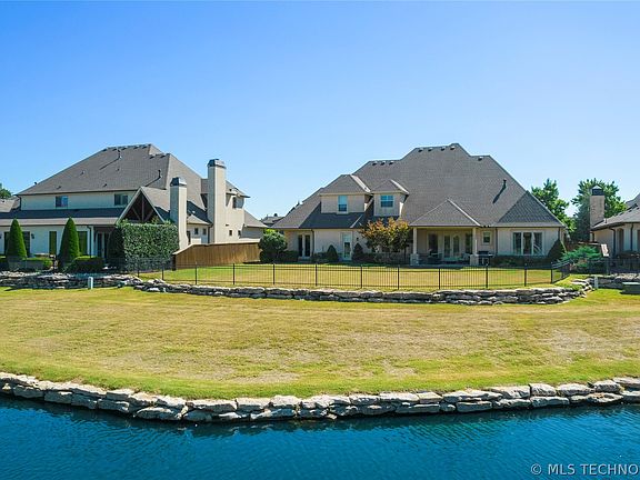 Timeless elegance abounds throughout this spacious home situated on a cul-de-sac lot backing to the picturesque pond in gated Tradition; Jenks Southeast schools! Brimming with beautiful craftsmanship; vaulted beamed ceilings with corbels, wood-trimmed windows and doors, plantation shutters, marble, hardwood floors with intricate inlays, and abundant natural light. Flexible floor plan boasts a formal dining room, vaulted study, great room open to large eat-in kitchen, wine room, powder bath, primary suite, second bedroom and a flex room (could be used as downstairs playroom, media room or bedroom) on the main floor; game room and three spacious bedrooms upstairs. Walk-out, decked attic storage. Serene pond views from the back patio and PLENTY of room for a pool; full hall bath opens to backyard - perfect for a pool bath. Ideal South Tulsa location!