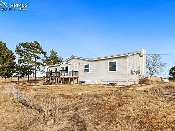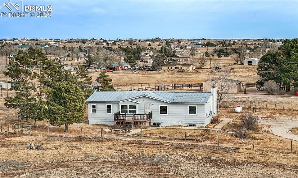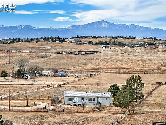 A fantastic opportunity awaits with this fully fenced 5 acre property featuring a 5 bedroom home with a finished basement, detached garage, loafing shed style barn with 2 stalls just minutes from all the amenities that Falcon offers! As you drive up you will notice the new exterior paint on the home, garage, and barn as well as the metal roof and usable decks on both the front and back of the home. Upon walking up to the front door you immediately notice the beautiful Pikes Peak views to the west that you can enjoy seeing from the front deck as well as many windows in the home. The inside of the home has been tastefully updated with brand new carpet, new interior paint, granite counters in the kitchen and both main level bathrooms. The main level features two living areas, one with a wood burning fireplace and the other featuring beautiful views out of the front picture windows. The primary bedroom has ample space, a walk in closet and an attached 5 piece bathroom. The finished basement features 2 more bedrooms, an additional room for an office or gym, full bathroom with a new tub and surround as well as an unfinished space perfect for all your extra stuff! The home also has a newer water heater installed in 2024, furnace in 2018, and a 40 year guaranteed metal roof. With no HOA you can bring your trailers, RV's, 4 wheelers and animals! Opportunities do not come along like this often, take a look and take advantage today!