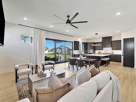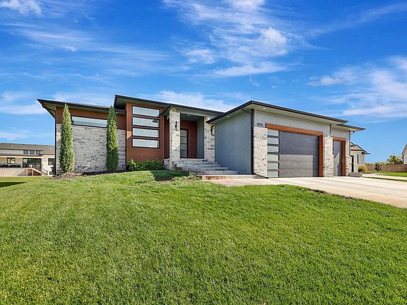 Located in the desirable Maize school district, this stunning home, built less than five years ago, offers modern luxury and convenience. Featuring four spacious bedrooms, each with its own en suite bathroom, plus an additional half bath on each floor for guests, this home is designed for comfort and style. The grand entry welcomes you with a statement pivot door and a custom handrail leading into the main living and kitchen area. The kitchen boasts a huge island, ample cabinets, a gas range, built-in oven and microwave, a gas fireplace, a wet bar with an ice-maker, and a 12-foot sliding glass door that opens to a covered deck. The East-facing backyard provides the perfect shaded retreat, complete with a TV wall for outdoor entertainment. The primary bedroom is a spacious sanctuary, with direct access to the laundry area for added convenience. The lower level of the home continues the theme of luxury and functionality, featuring a large living area, another wet bar, and plenty of cabinet space, making it an ideal space for relaxation and entertaining. This home truly combines modern design with thoughtful details to create an exceptional living experience.