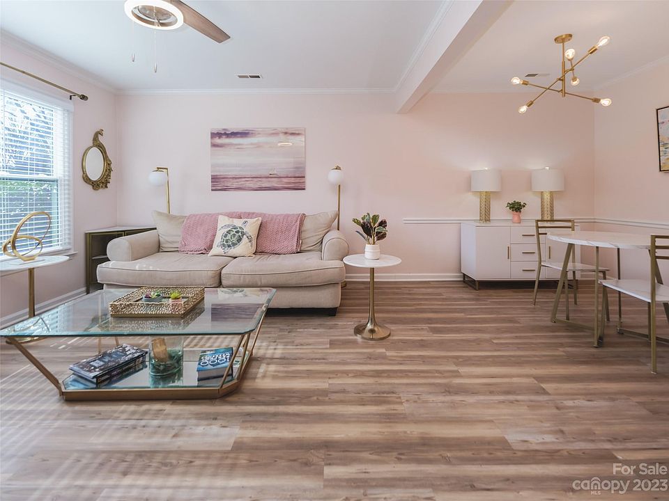 THIS WON'T LAST LONG!!!! Lovely updated townhome in Oakdale Place Community. Convenient Charlotte location in a quiet community with no through traffic. The home features an open space living-dining area, gas fireplace(sold as is), kitchen with eat-in space, and access to the private back courtyard. Laundry and ample storage on the main level. The second floor features 2 bedrooms with ensuite baths for each. Crown molding on the main level, ceiling fans, and LVP flooring throughout. This won't last long. Ring doorbell, and digital keypad, washer, dryer, and refrigerator included. ASSUMABLE mortgage 4.5% with lender approval.