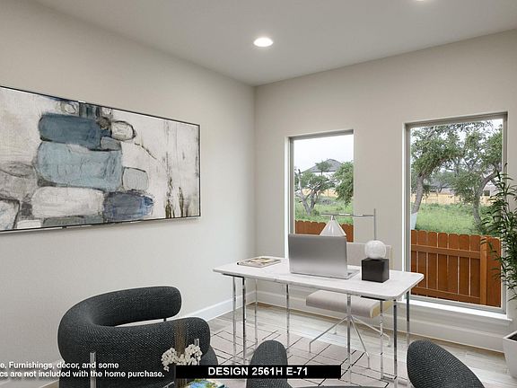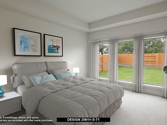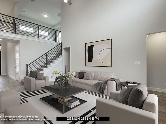 Home office with French doors set at two-story entry. Two-story family room with wall of windows opens to kitchen and dining area. Kitchen hosts inviting island with built-in seating space and 5-burner gas cooktop. First-floor primary suite includes dual vanities, garden tub, separate glass-enclosed shower and large walk-in closet in primary bath. A second bedroom is downstairs. Two secondary bedrooms and a game room are upstairs. Extended covered backyard patio. Two-car garage.