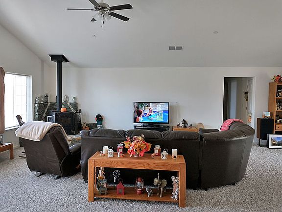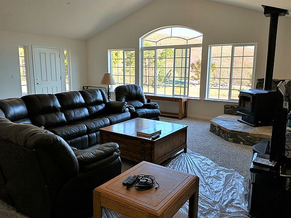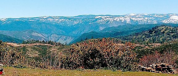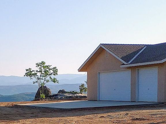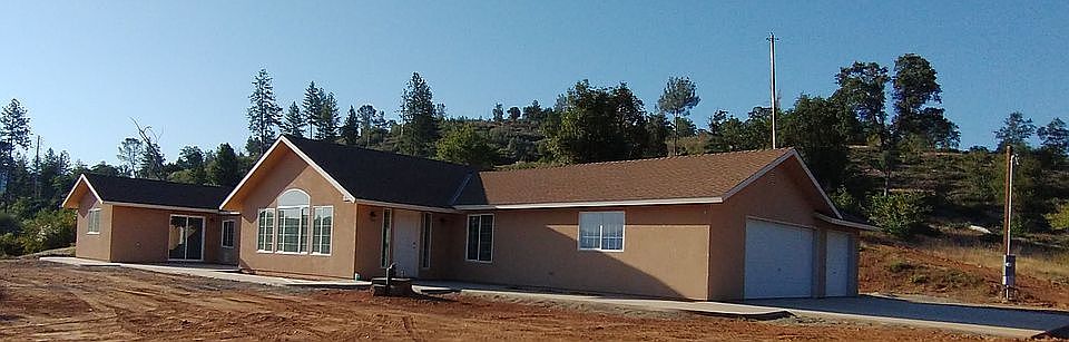 Spacious one story ranch in the Sierra foothills with an awesome view of the Sierra Nevada mountains and the northern section of Yosemite National Park. The home has 4 bedrooms and 3 bathrooms and totals 2300 square feet of living space. One of the bedrooms is currently set up as an office / guest room. The kitchen has two eat-at counters and opens up into a large great room. The great room has a cathedral ceiling and a large window that faces the incredible mountain view. The great room also has a wood burning stove on a hearth made of stone found on the property. There is a dining room next to the kitchen. The master bedroom suite has a bathroom with a jetted tub and a separate tiled shower. It also has a large walk-in closet. The utility room for the washer and dryer is located near the bedrooms. There is an attached three car garage with space for a workshop. Outside there are patios in the front and back of the house. The rear one is covered for those hot sunny days or rainy days. Behind the garage is a solar panel covered carport high enough to park an RV under it with room leftover for one or two cars. There is a separate 1560 square foot garage / shop and a 320 square foot enclosed storage unit.